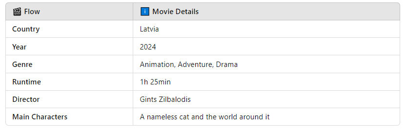 Some films don’t just tell a story—they immerse you in an experience. Flow (2024), directed by Gints Zilbalodis, is one of those rare cinematic journeys that defies convention, embraces silence, and speaks through movement. This stunning Latvian animation, which went on to win the Academy Award for Best Animated Feature, is a film about survival—but more than that, it is a film about the rhythm of life itself. With no dialogue and a deeply immersive visual style, Flow proves that storytelling can be just as powerful without words.